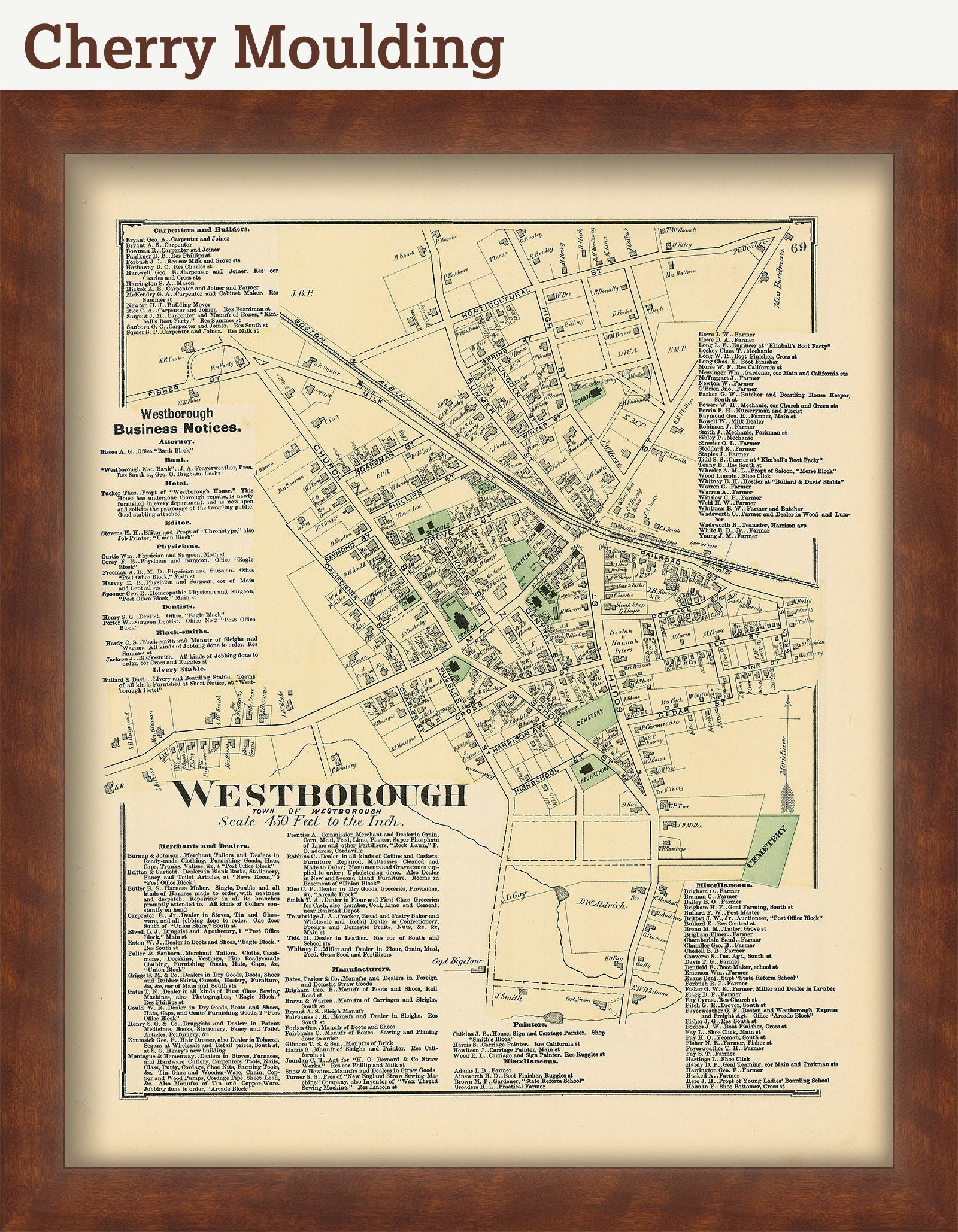 A Reproduction of a colored map of the Village of WESTBOROUGH, from a Atlas of Worcester County, Massachusetts 1870.