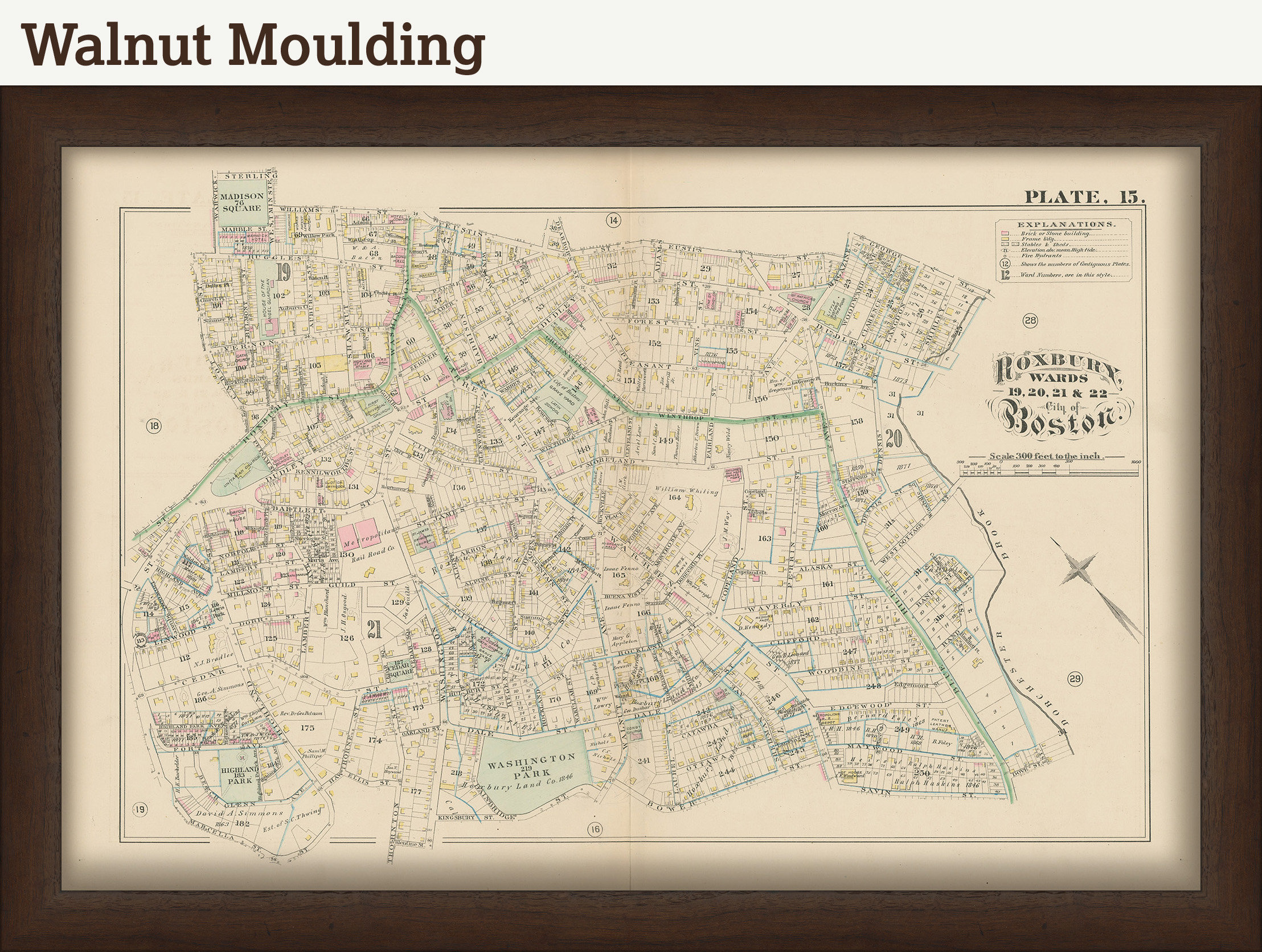 Framed maps include dry mounting, UV filtering glass, and your choice of six mouldings, wired and ready to hang upon delivery. All mouldings are approximately 1.5" wide. Please factor in an additional 3" to the listed size for framed items.
