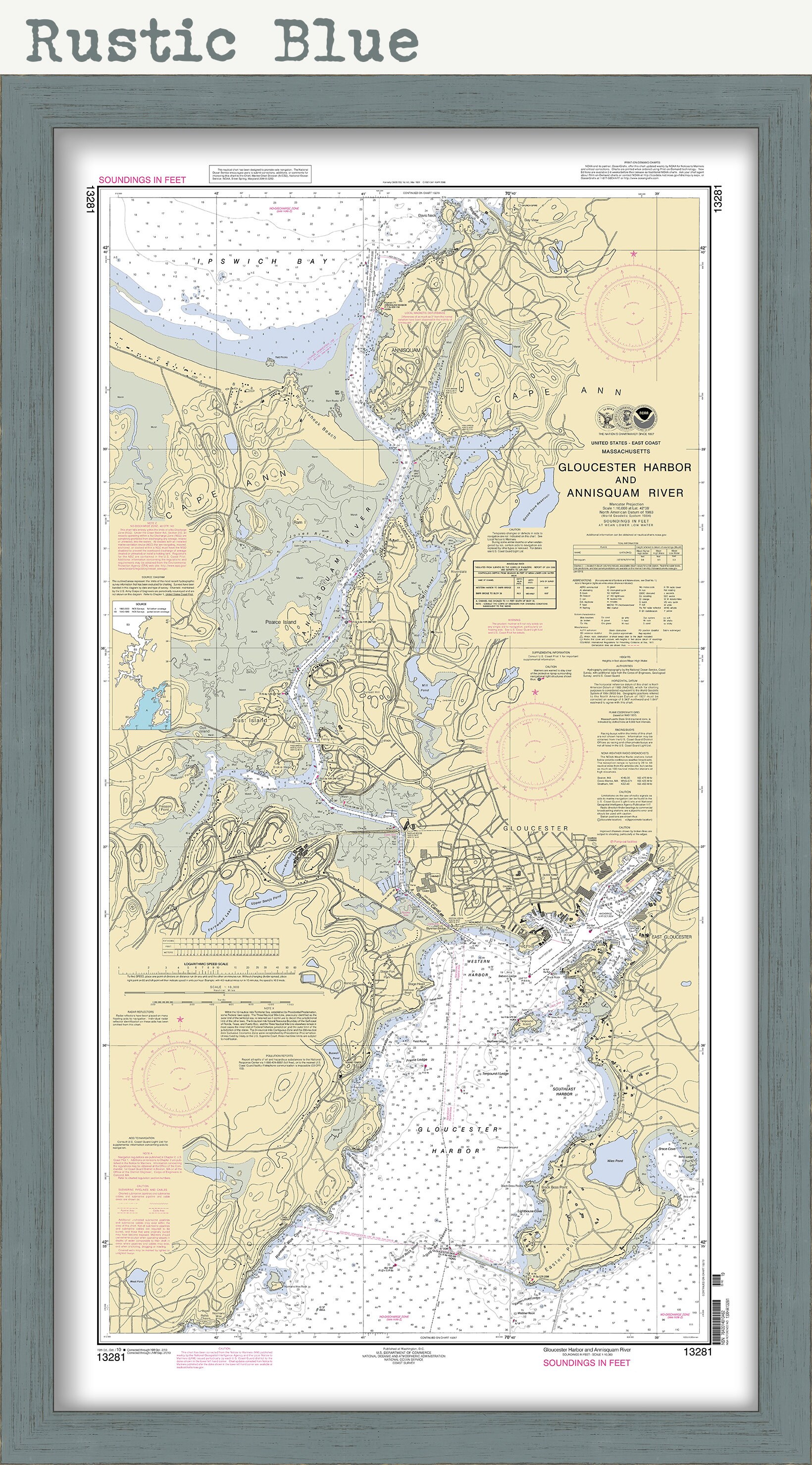 A reproduction of a Nautical Chart of GLOUCESTER HARBOR and Annisquam River, Massachusetts originally published in 2010 by NOAA.