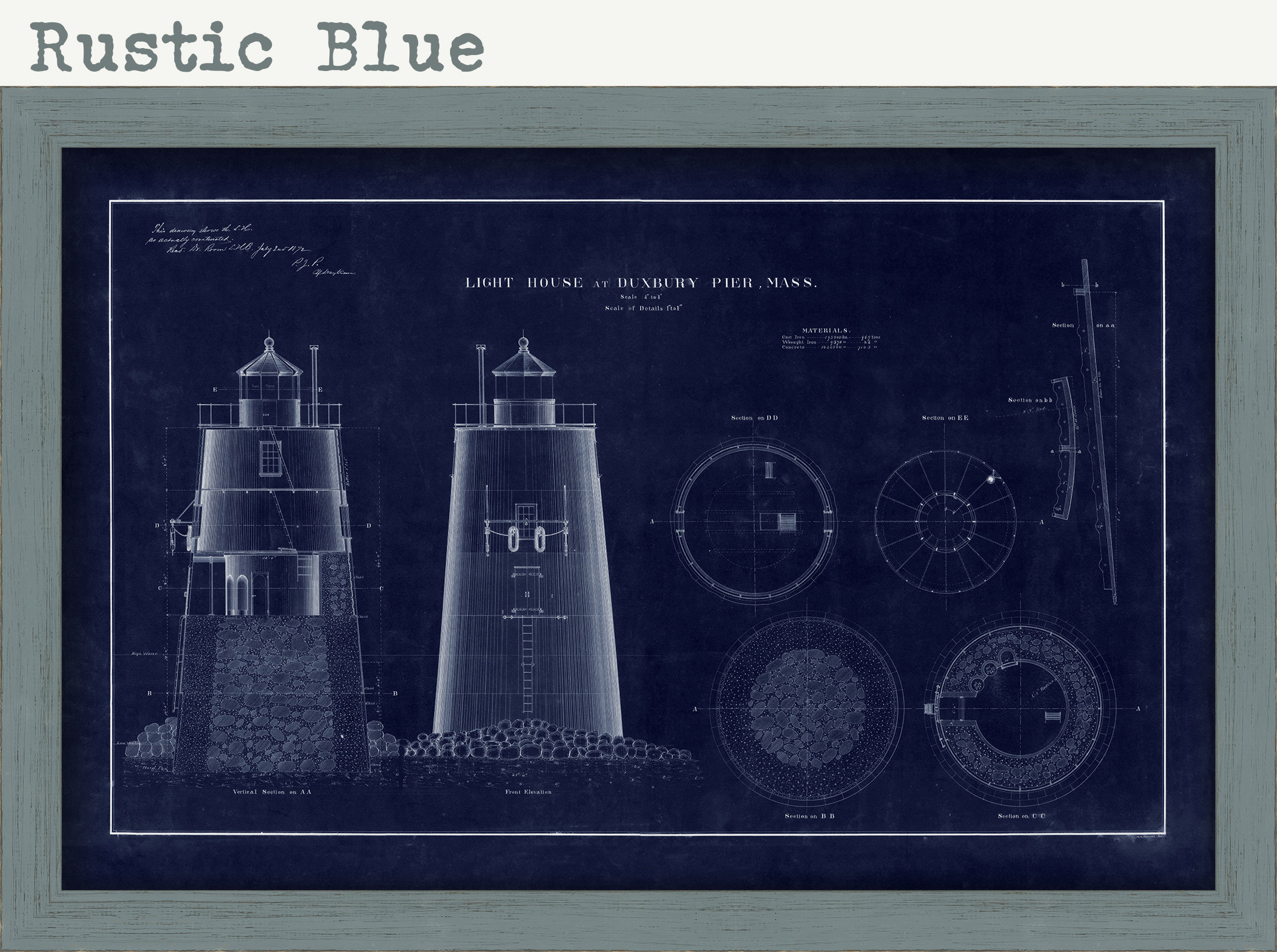 A reproduction Blueprint Plans for Duxbury Pier Light, AKA bug light the iconic and much loved lighthouse at the Entrance in Duxbury Bay, near Plymouth Harbor, Massachusetts. First Lit on September 15th, 1871, the original structure looks quite a bit different than it does today. The catwalk around the top of the lighthouse was not part of the initial design, but added later in 1897. Made of cast iron, bug light stands 35 feet above high tide.