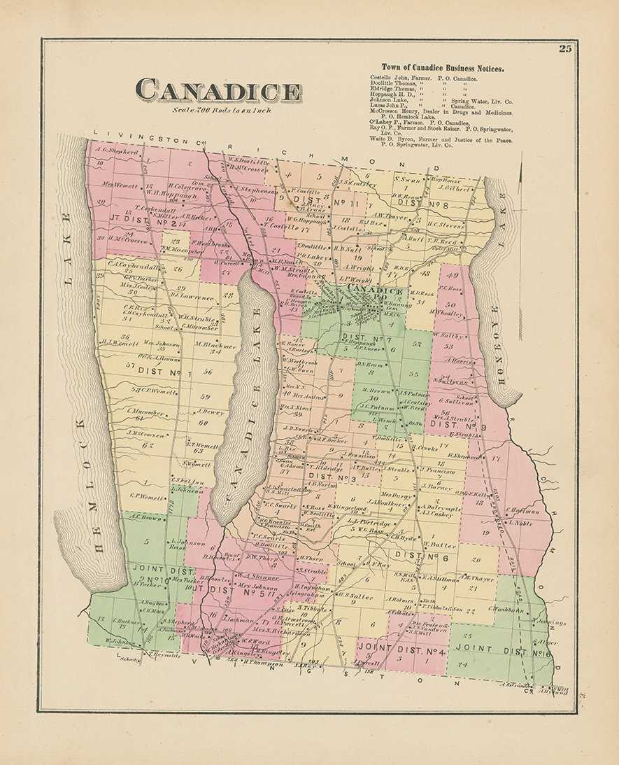 A Reproduction Map of the Town of CANADICE, ONTARO COUNTY, New York, from a Atlas of Ontario County, New York published by Pomeroy, Whitman and Company in 1874.