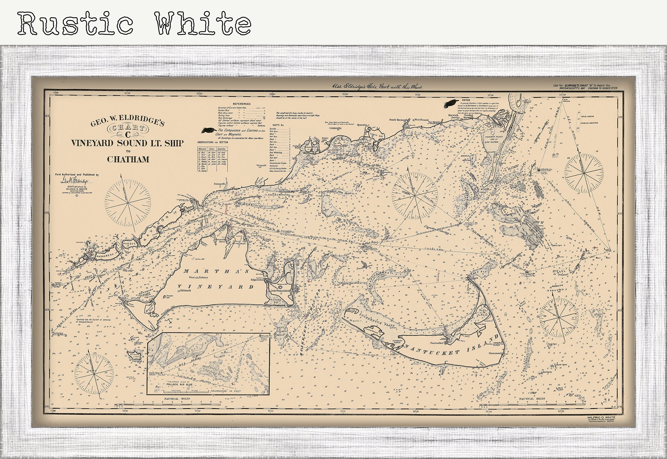 A Reproduction of a Nautical Chart of Vineyard Sound Lt Ship to Chatham-Chart C- by George W. Eldridge 1924. Eldridge Charts are renowned for bold lines and a clear and concise style.